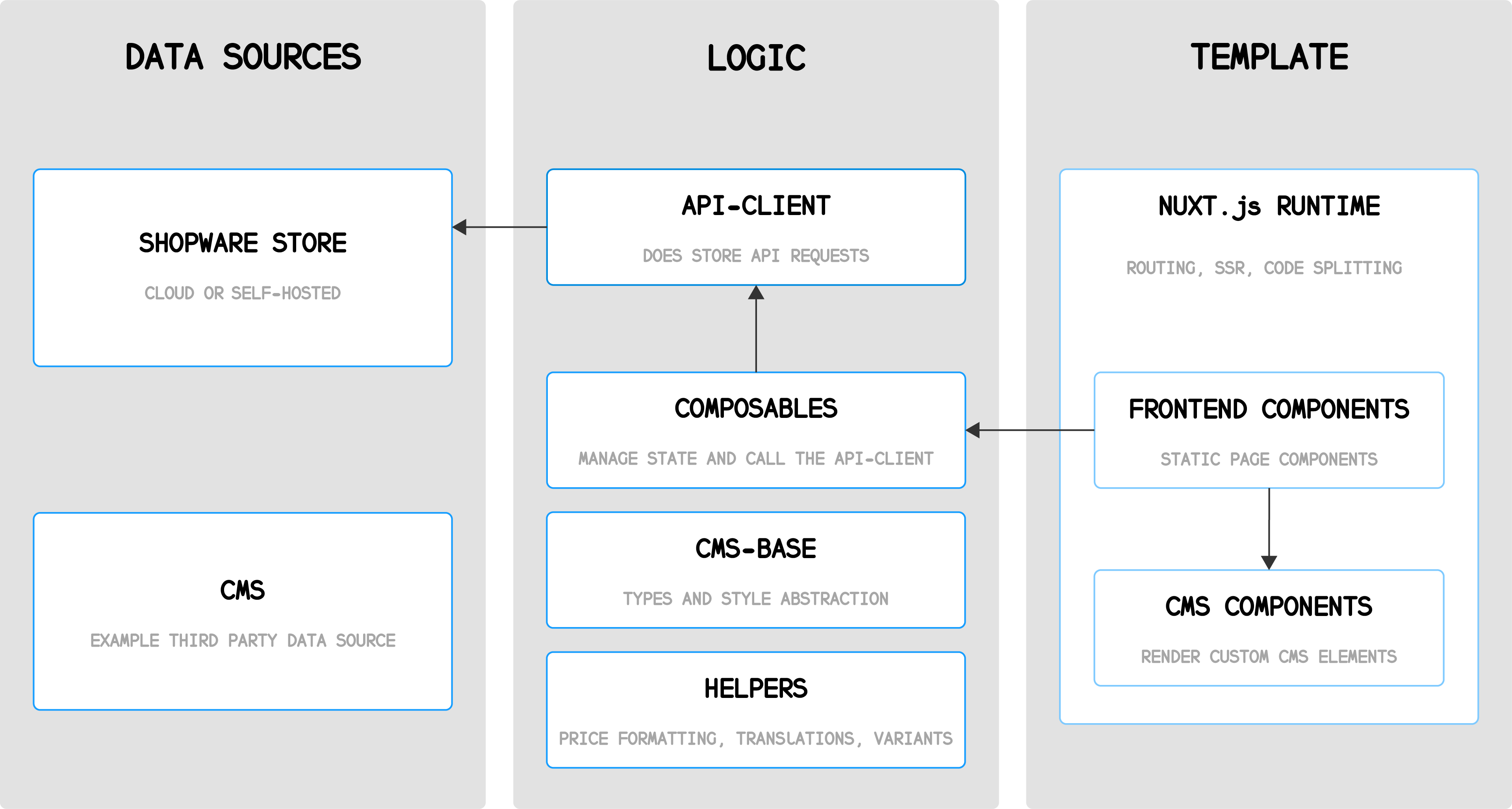 A big part (and a risk factor) of every custom storefront project is the implementation of domain-specific business functionality. That's why Shopware Frontends offers various packages that take care of some heavy lifting: